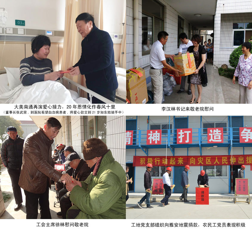 公司成立二十五年以來(lái),從初期連續(xù)十年支助二個(gè)孤兒開(kāi)始,先后資助新疆伊犁多名貧困學(xué)生,連續(xù)多年看望慰問(wèn)幸福敬老院、秦灶敬老院、唐閘敬老院、市北養(yǎng)老中心的老人,對(duì)素不相識(shí)的癌癥病人、重危病人、交通事故致殘人員、燒傷燙傷等病人給予醫(yī)療費(fèi)支助,向四川汶川、雅安、青海玉樹(shù)、云南魯?shù)榈卣鹫饏^(qū)和鹽城6.23特大龍卷風(fēng)等災(zāi)區(qū)積極捐款,樂(lè)施港閘市政人的援助之手,為使愛(ài)心傳承更久遠(yuǎn),施援更高效,公司已分別在南通市慈善總會(huì)、港閘區(qū)慈善總會(huì)冠名了各100萬(wàn)元的愛(ài)心基金,為特困人群雪中送炭,讓愛(ài)的種子、好人文化在港閘市政薪火相傳。